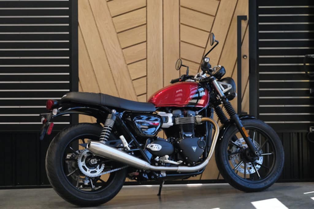 Purchase any MY23 or MY24 motorcycle from the Triumph Bonneville line-up with No Payment, No Interest, and No Money Down for 3 Months with Freedom Road Financial & Sheffield Financial.+*+No/No/No offer eligible on new MY23/MY24 motorcycles 900cc+ in the Triumph Modern Classic family.*Cannot be combined with any other offer. 2024 Triumph Speed Twin 900 Carnival Red/Phantom BlackThe newly re-named Speed Twin 900 comes in three colors, including classic Triumph Jet Black, a Matte Ironstone and a sophisticated new Matte Silver Ice option, with silver and yellow accents.Features may include:UPDATED HIGH TORQUE TWINThe Speed Twin 900’s updated 900cc HT Bonneville engine delivers thrilling performance with 59 LB-FT peak torque and 64 HP peak power, and all of that classic British twin sound.ICONIC DESIGN DNAThe 1959 Bonneville spirit lives on with the Speed Twin 900's stripped-back custom classic style and iconic Triumph DNA – from its silhouette, to its signature knee indents, engine fins and twin upswept silencers.PREMIUM DESIGN UPDATESIncluding cast wheels with machined spoke detailing, a stylish bench seat, side panel design and premium foil tank decals, plus throttle body finishers and brushed aluminum headlight brackets.ENHANCED COMFORTThe Speed twin 900’s trademark comfortable easy ride comes courtesy of an accessible 30.31 in low seat height and excellent stand-over ergonomics, now with a bench seat with thicker seat foam, for even more comfort.CONFIDENCE-INSPIRING RIDEHigh-specification brakes, suspension and tires, torque-assist clutch, rider-focused technology and comfortable rider ergonomics all combine to deliver the Street Twin’s renowned confidence-inspiring ride.HIGH-SPECIFICATION BRAKESHigh-specification Brembo 4-piston front brake caliper with a 310mm disc delivers excellent stopping power, for great rider control, with exceptional bite and feel.HIGH-QUALITY SUSPENSION41mm cartridge front forks with traditional stylish rubber fork gaiters and twin rear suspension units, both with 4.72 in (120mm) wheel travel, deliver a comfortable ride in all conditions.ADVANCED TECHNOLOGYRoad and Rain riding modes, which adjust the throttle map and traction control settings, switchable traction control, ABS, distinctive LED rear light, under seat USB charger and an immobilizer.